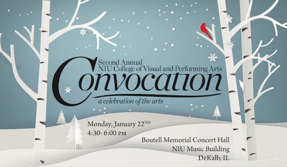 The second annual NIU Arts Convocation presented by the College of Visual and Performing Arts will take place Monday, January 22nd 4:30-6 p.m. at the Boutell Memorial Concert Hall, 1425 Lincoln Hwy, DeKalb, IL. The evening will showcase work from the schools of Art and Design, Music, Theatre, and Dance.