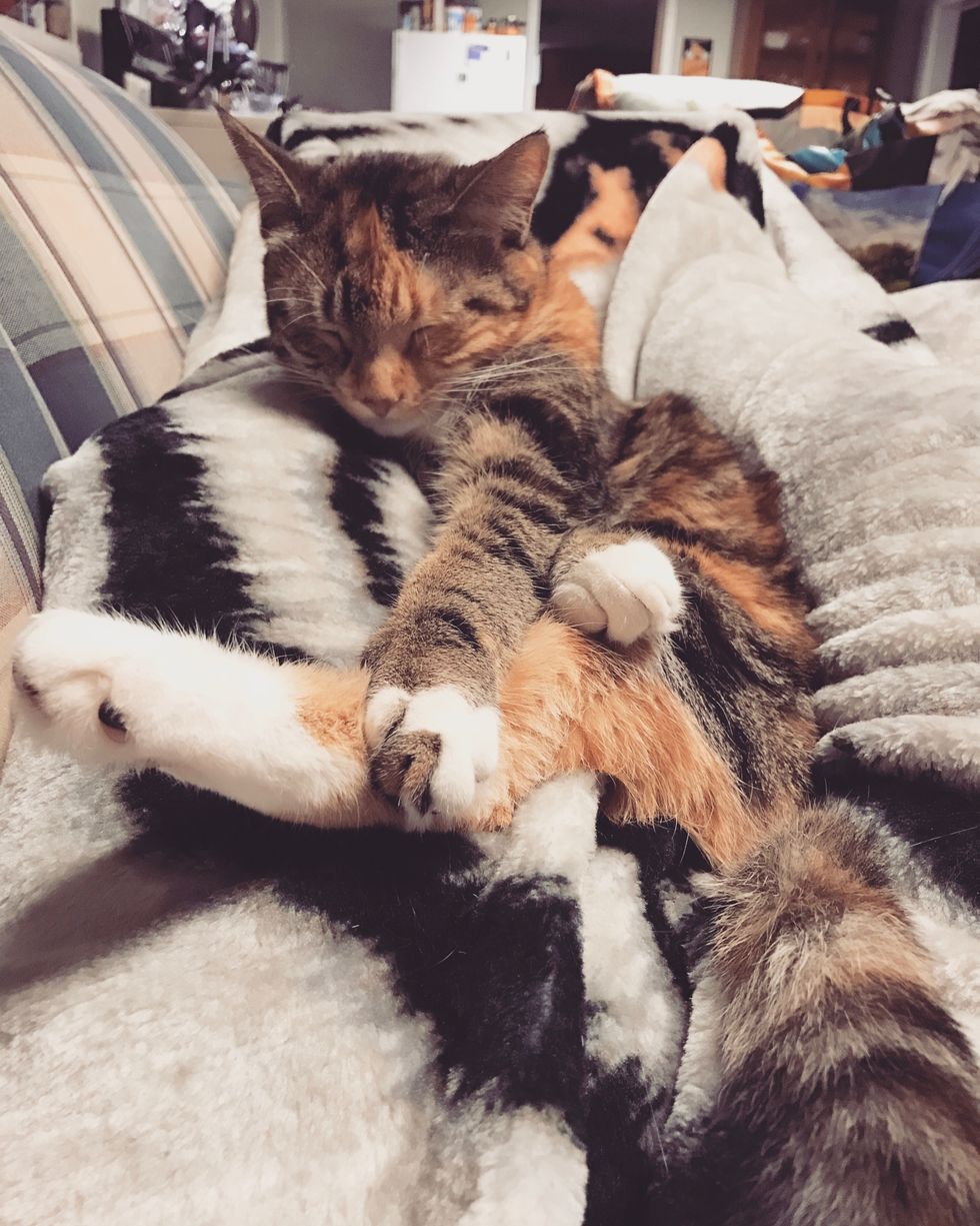 They knead the fuzzy blanket covering me and purr loudly, content with their comfortable napping spot.