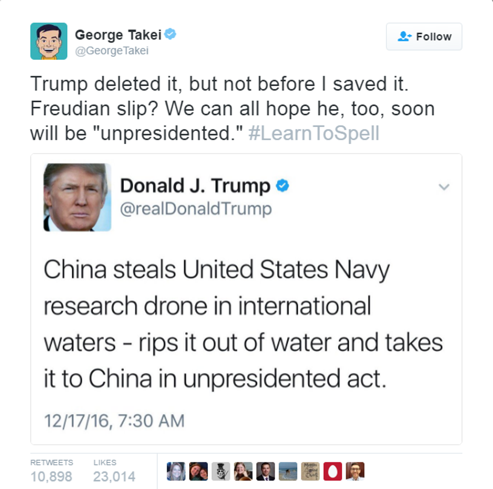 On Saturday, Trump sent out a tweet about the Chinese seizure of an underwater US drone, calling it "unpresidented." He later corrected the tweet to instead say "unprecedented."