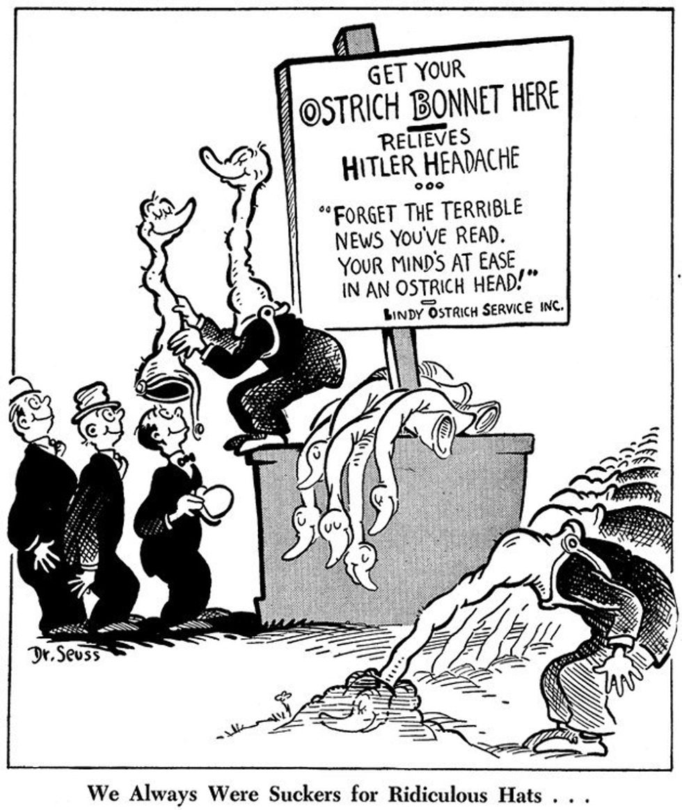 Here's one cartoon critiquing the blatant naiveté of the early WWII America First Isolationist policy and how political inaction in foreign instances of oppression is nearly as morally condemnable as the acts of oppression in themselves. This was a sentiment expressed often in Seuss' political cartoons, and one that modern readers find to be particularly salient in regards to Trump's executive orders regarding immigration and Syrian refugees.