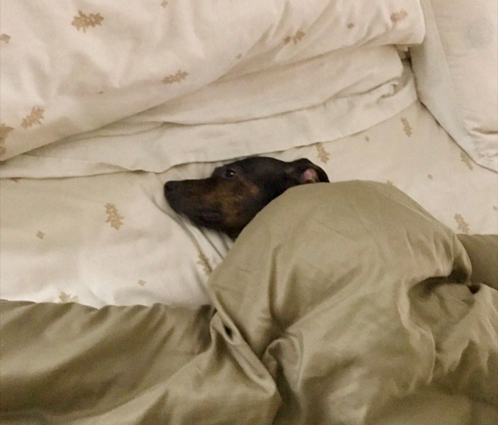We've had our share of friends who stole the covers at sleepovers when growing up so it's not something we aren't used to, it's just unexpected. Who thought a dog with just paws and a nose could find a way to wrap themselves in the covers and steal any blanket you tried to claim!
