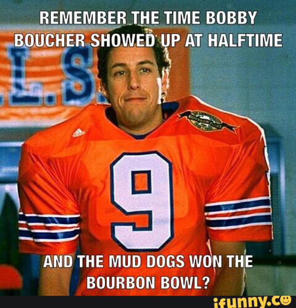 The South Central Louisiana State University Mud Dogs weren’t even suppose to even make it to the Bourbon Bowl, let alone win it. Once Bobby Boucher showed up at halftime the Mud Dogs took the game into their own hands and beat the Cougars 30-27.