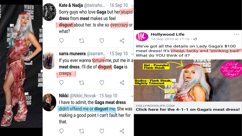 In political fashion shows the use of uncommon materials to make a piece of clothing can fill audiences’ minds with curiosity and make a powerful statement. Shocking arts can impact emotions, help audiences learn about social problems, and make them politically active. For example Lady Gaga’s outfit, which was made of cow’s meat, was believed by the designer that it could make a powerful impact as a way to promote the idea of gay rights. In 2010, Lady Gaga wore a dress made of raw meat to the Video Music Awards. The designer of that dress, Franc Fernandez’s message was every individual has the same flesh, gender differences are mere things to divide people, so every person is equal in claiming their rights and dignity. He was voicing his thoughts about the 'Don't ask, don't tell' policy in military service which did not let non-heterosexual service people disclose their sexual orientations. However, that dress was infamous. On social media the public criticized the dress. Even though public reaction was negative, those criticisms worked as a great advertisement. Bad designs are remembered more than good designs. In fact, it does not matter to haute couture designers if audiences get their message, love their dresses, or dislike them. What was important was the public was talking about the meaty dress, they were interested to know who made that unwearable stuff, and that made Franc Fernandez much more famous. So, designers mainly use couture to promote their market and make more money. Also, since the public are curious with celebrities’ fashion styles, designers sell their designs to them to present their products to a wider range of customers.