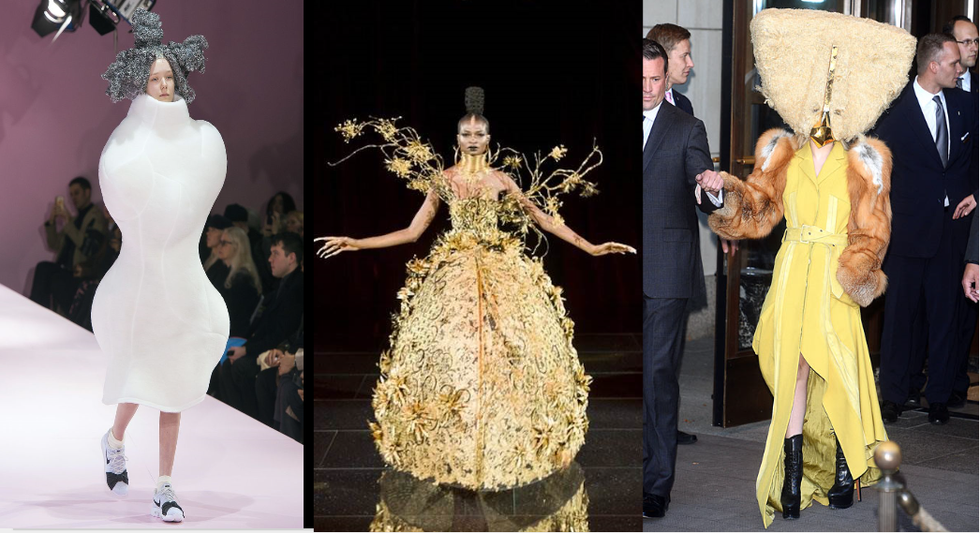 Surrealism is thought-provoking and dramatic, it gives life to a dress, and pleases admirers of high art with a combination of fashion and surrealism. Sometimes the details of surreal designs are mysterious, this leaves audiences to imagine something, otherwise it would be boring if every art piece was easy to understand. However, designers began to exploit the idea of surrealism because it worked as a preventive measure—since there is no originality protection laws for designers, designers followed the trend of unimaginable outfits in order to create a unique product which would be too hard for knock-off artists to copy. This helps them to claim their designs to be original. In the pictures above: 1) The white shell has secret details. The white lines on it are almost invisible, and we cannot see under the shell. 2) The dress made of gold is rare. Not everyone can afford and copy it. 3) Lady Gaga made a fabulous entry with her chicken costume. Even though she went blind for a day, her outfit grabbed media’s attention.