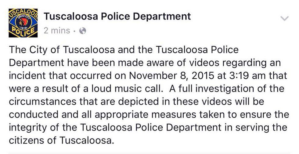 Chief Steven D. Anderson of the Tuscaloosa Police Department released a statement naming Officer James Kent, Officer Phillip Champion and Officer Gregory Pimm as the officers placed on administrative leave pending further investigation into their actions.