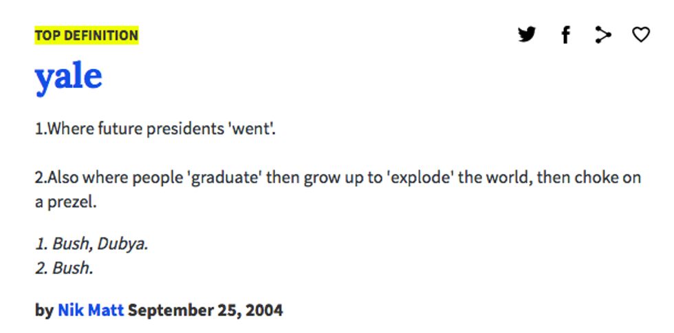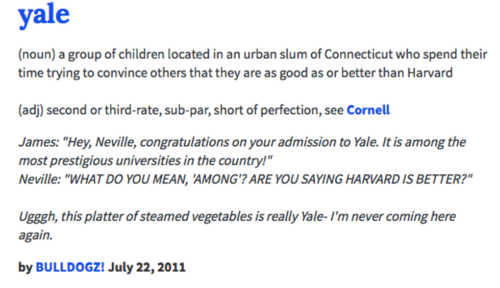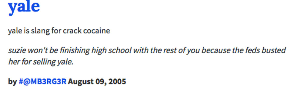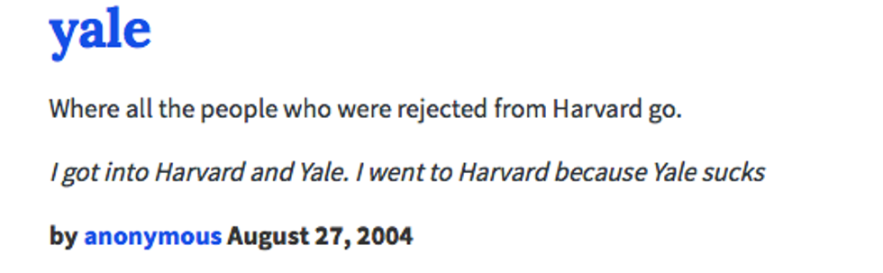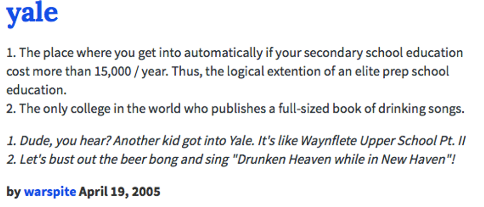 Urban Dictionary: where the Internet goes to learn about slang. So what happens when you head to Urban Dictionary and search for non-slang terms? What happens when you look up the Urban Dictionary of your university, an Ivy League institution that was founded in 1701 and is older than the United States, the Internet, and especially Urban Dictionary? Hilarity ensues, that's what. As a Yale student, some of these ring so true that they hurt. Others make me wonder if I'm not getting the most out of my Yale experience. Apparently, I've been defining Yale all along, because here is how Urban Dictionary defines Yale.