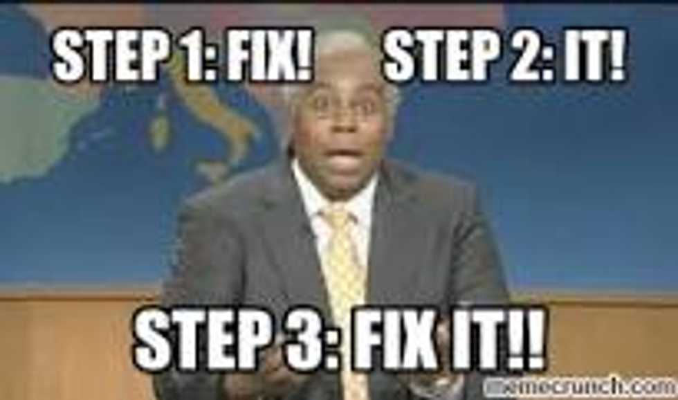 So, in the words of Kenan Thompson, in one of my favorite SNL skits ever, this is what I have to say: "FIX IT! FIX IT FIX IT FIX IT! STEP ONE, FIX! STEP TWO, IT! STEP THREE, FIX IT! REPEAT THE PROCESS AS NECESSARY UNTIL IT'S ALL BEEN FIXED!"