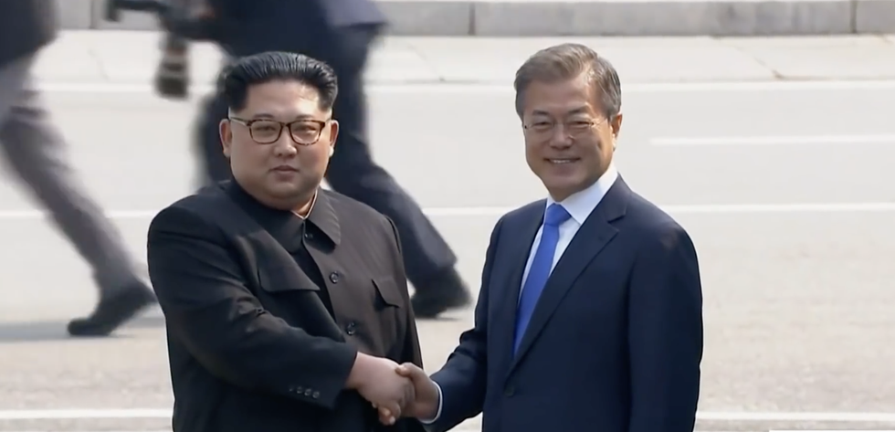 Kim Jong-un (left) and South Korean president Moon Jae-in shake hands at the village of Panmunjom in the Demilitarized Zone (DMZ).