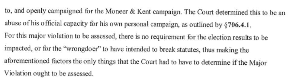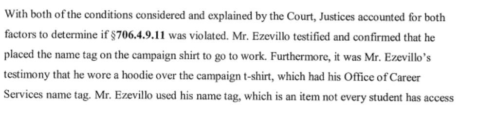 In the majority opinion published by the court, USF's Supreme Court concluded that campaigning with materials not readily available to all students constituted an abuse of power. This includes name tags, polos associated with student offices, and more. The majority opinion stated that there was no question as to whether or not MoKent staff Deka Ezevillo campaigned in his name tag or Career Services polo. The main discussion was whether these actions constituted a major violation for which Moneer and Kent could be held liable and the court's answer was yes.