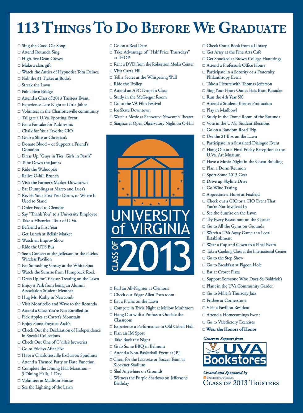 So, as I thought about writing this, I knew I needed to actually find a copy of this list—and guys, I did. I found the official UVA Bucket List on fourthyearbucketlist.wordpress.com. There’s a whole WordPress blog dedicated to it?! Is that wild to anyone else but me? There are things on this list that I’ve never heard of, but there are also a bunch of things that I’ve actually already done!