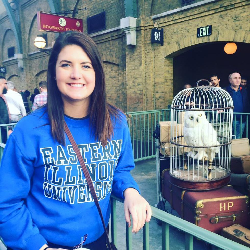 Me with Hedwig, Harry's owl, about to ride the Hogwarts Express!