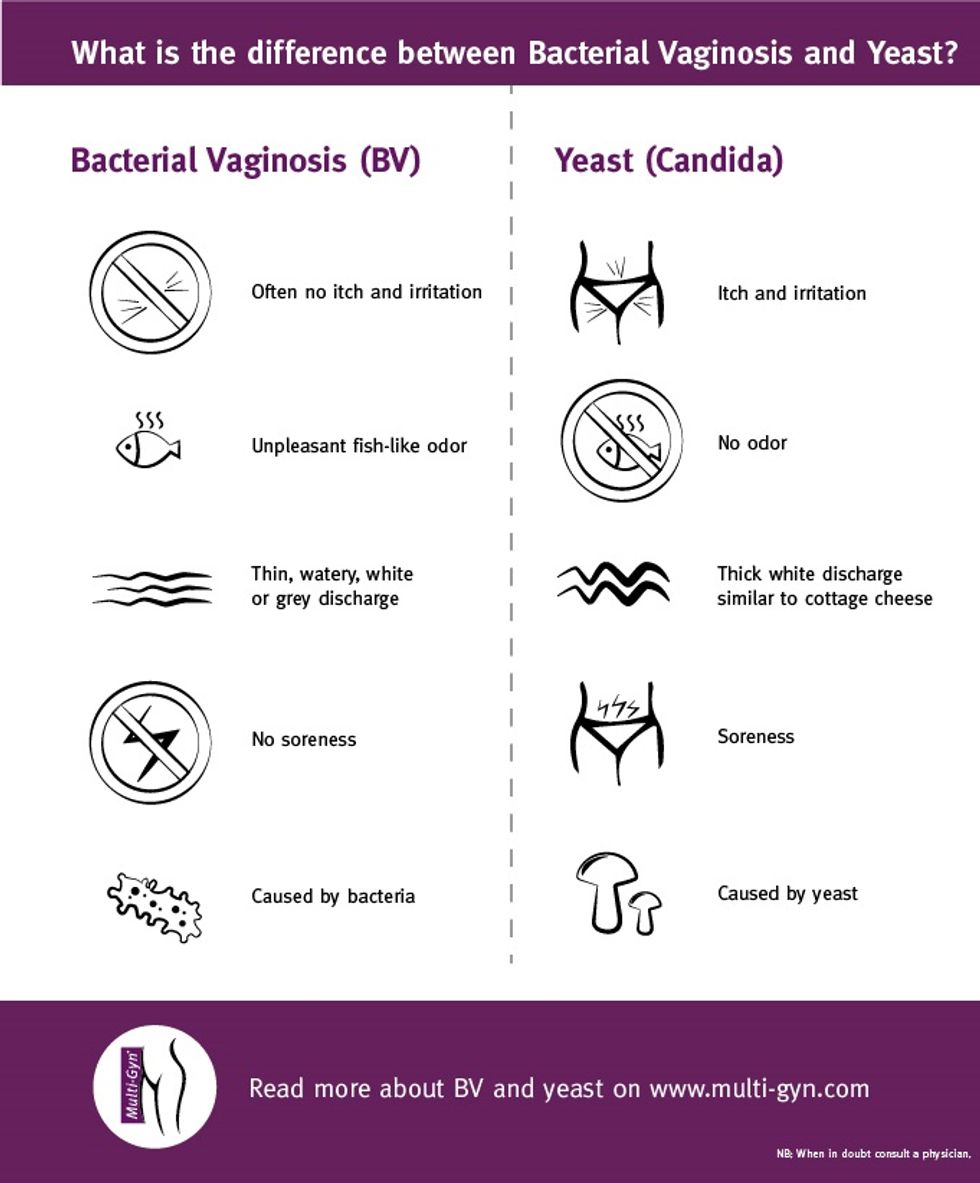 Though easily confused, bacterial vaginosis and a yeast infection are not exactly the same; BV is an overgrowth of naturally occurring vaginal bacteria, and a yeast infection occurs due to an overproduction of naturally occurring vaginal yeast. The reason they are often confused for one another is that both result in the super fun vaginal discharge that makes you feel oh so soft and feminine (100 percent sarcasm). You can see a side by side comparison of the symptoms in the image below. Both are distracting and uncomfortable when they occur, but are totally treatable.
