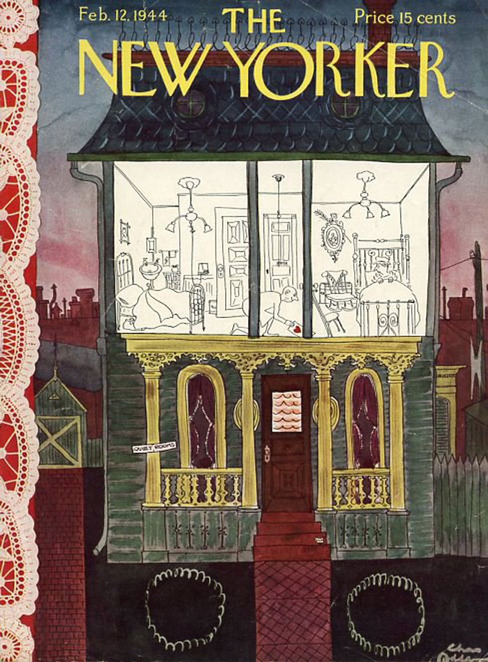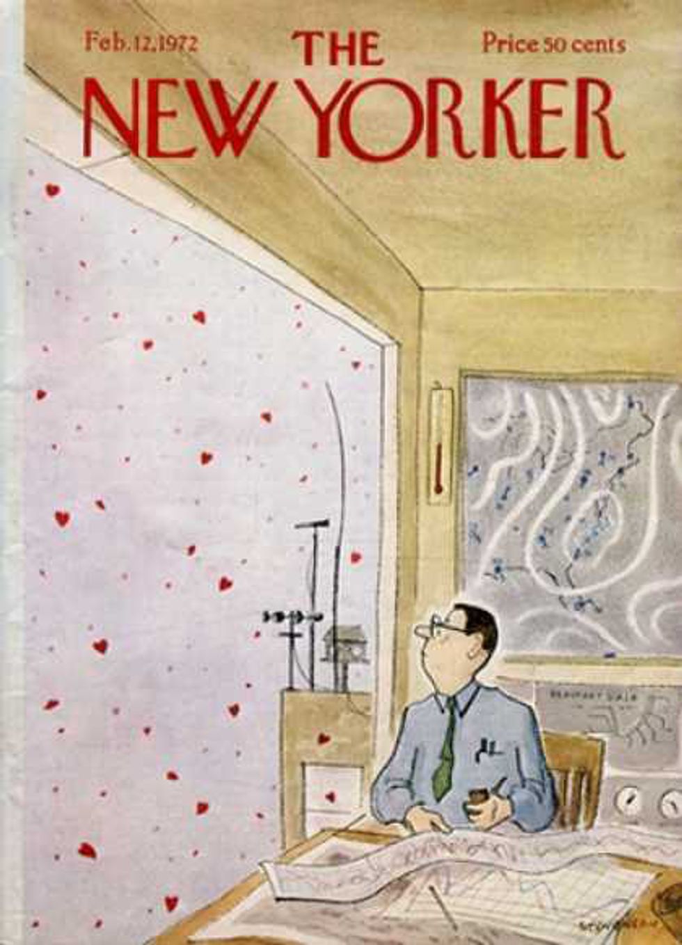 At first glance, I thought this cover was meant to evoke sympathy for the soldiers fighting in WWII, as they're not home with the people they love. However, when you look closely, you can see that this sailor is actually leafing through his little black book, writing Valentines for all of his girlfriends---one in every port he's stopped at. The New Yorker has always been ahead of its times, so it comes as no surprise to see the cover artwork taking a jab at young men.