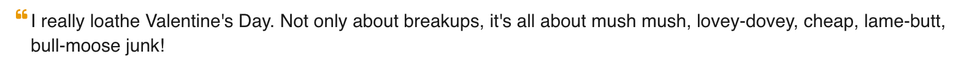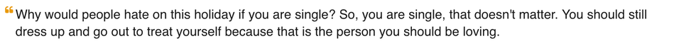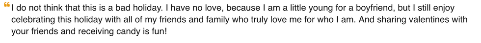 Regardless of whether or not you decide to celebrate the holiday, just try not to add to the negative energy that will always surround it. Sure, it might be a cheesy Hallmark holiday and it can get annoying, but at the end of the day, what's the point of complaining about something with such a positive message? If you're not going to dedicate February 14th to some kind of love in your life, at least treat it like any other day of the week.
