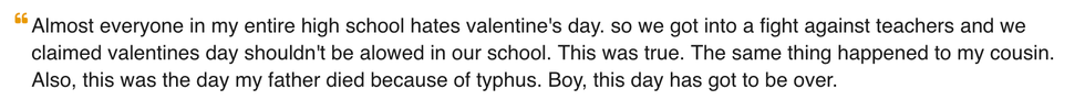 I've never had anything against Valentine's Day-- I mean, it's not up there with Halloween or Christmas, but it's no Arbor Day either. At it's best, it's a day dedicated to celebrating love, which is pretty cool to me. At it's worst, it's an excuse to buy all the discounted candy you can eat on February 15th. I feel like that's not too bad as far as holidays go, and yet for some, it's one of the more dreaded days of the year. When people have negative opinions on Valentine's Day, it's typically because they're hung up on the romantic or commercialized parts of it. If you think it's a holiday all about celebrating romantic relationships by spending a lot of money on grand gestures you might've seen on TV (or in the hallway of your high school) there's definitely a chance of getting disappointed.