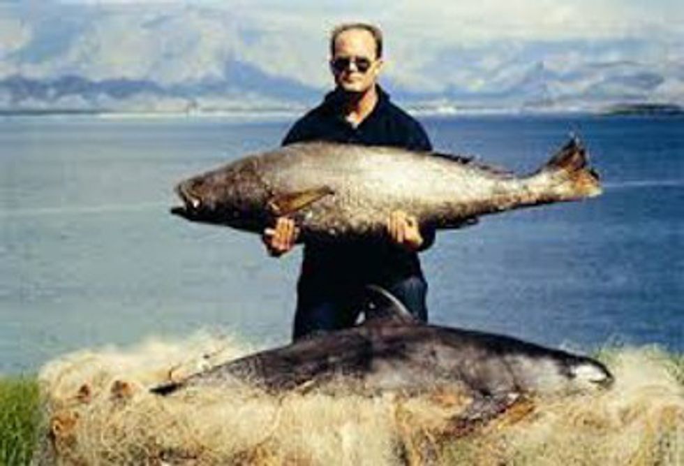 (A man holds a tatoaba fish above the unintended catch of vaquita porpoise, caught in a gill net. Source: marinemammalcenter.org)