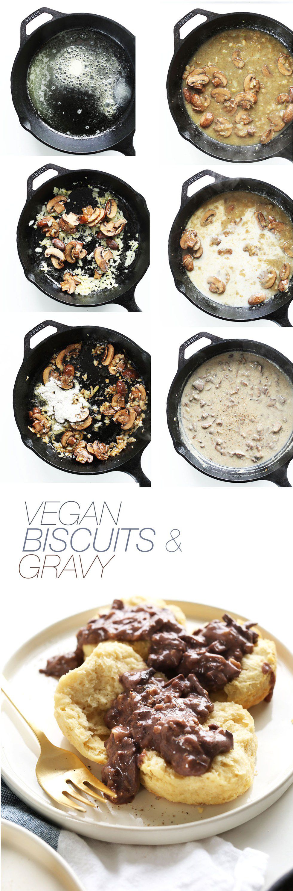 Flaky vegan biscuits with thick, peppery mushroom gravy! A flavorful, healthy, satisfying 30-minute vegan breakfast.