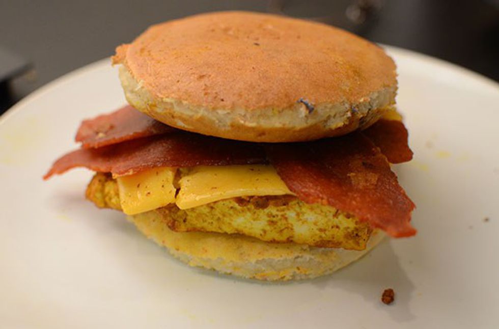 4. Place on plate in the following order: drizzle syrup, pancake, tofu, cheeze, sausage, pancake, and drizzle the very top with more syrup!! Must eat with a fork, it's huge!!