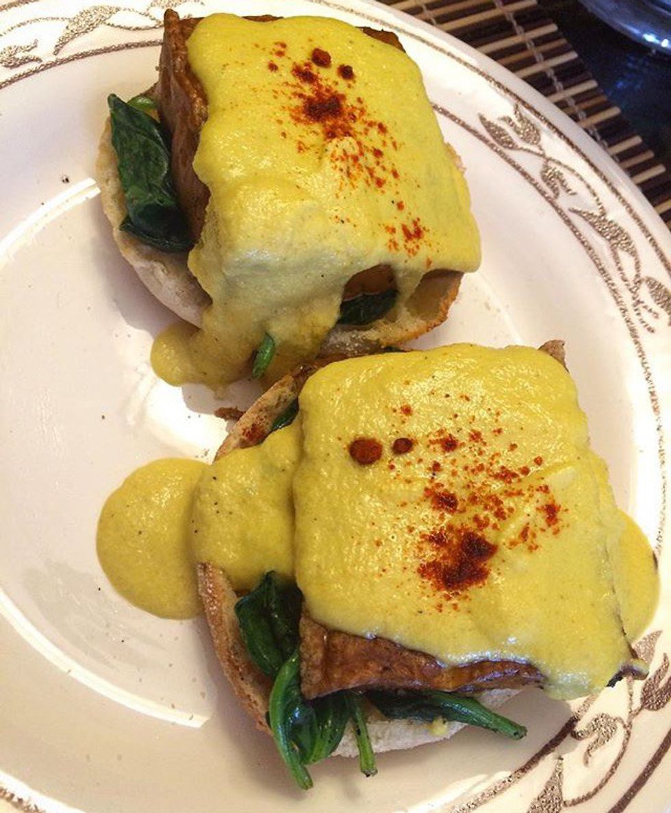 An example of a more "junky" breakfast would be the day that I decided to attempt vegan eggs benedict. Seriously. It's a thing. Let's just say it was an extremely exciting day for me! It features an English muffin, smoked tofu, sautéed spinach and numerous different spices for the "hollandaise sauce." I followed the recipe posted by HotForFoodBlog.com and I will definitely be recreating this again sometime in the near future.