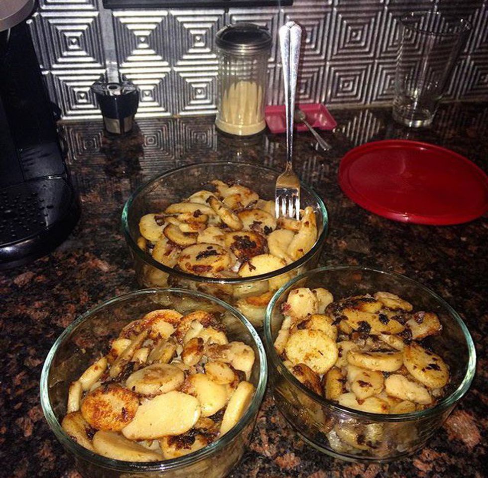I frickin' love potatoes! They are so diverse and can be used to make cheese sauces, soup, fries and, my personal favourite, hashbrowns! To make the hashbrowns, I slice the potatoes into little circles and I fry them in vegan butter with some red onions, salt and pepper. And some people are convinced that all vegans can eat is grass! C'mon people! I often make a triple batch when preparing these so I can have breakfast potatoes for up to two weeks!