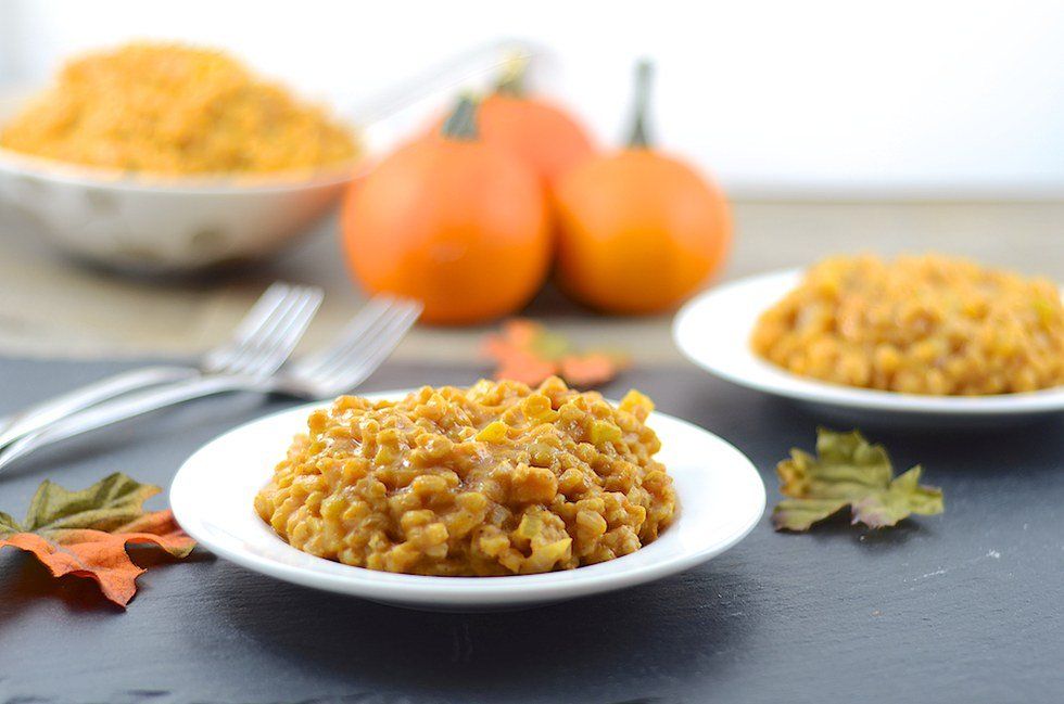 Stir in one can of pumpkin puree, a pinch a salt, and an eighth of a teaspoon of nutmeg. Season with pepper, stir until the mixture is hot.