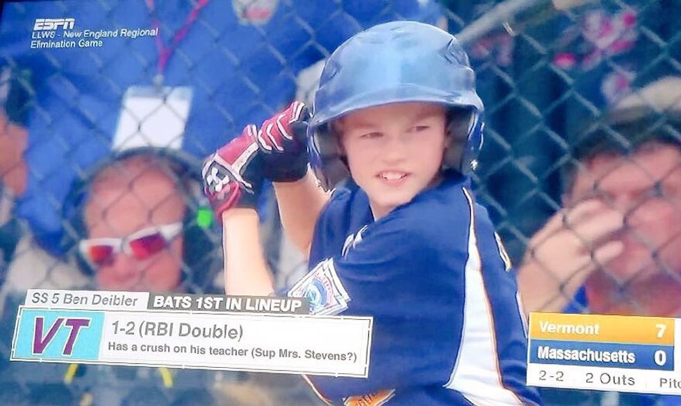 The team Essex Junction's little leaguer, Ben Deibler, who seems to have taken the media by storm, is the batting lead off and short stop for his Vermont team which beat Massachusetts this past Tuesday. While Deibler is well known for his advanced and developing skills on the field, his fame took off this week due to a photo that went viral on Twitter. The Little Leaguers have the option to state a fun fact about themselves that they'd like to be shown under their name while they are at bat; while millions know Ben Deibler's fun fact to say "Has a crush on his teacher (Sup, Mrs. Stevens?)," it turns out that his fun fact was something different, and he never actually 'hollered' at his teacher.