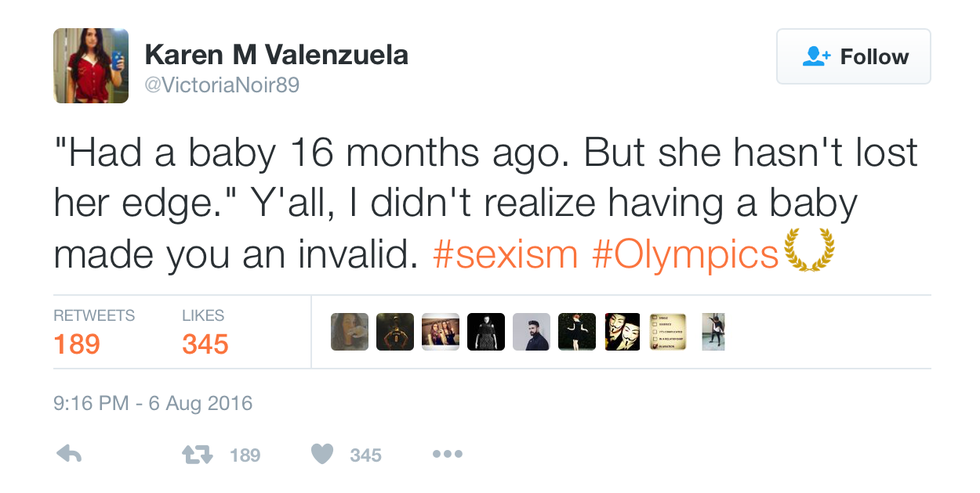 Over the past 100 years, women have come a long way in the world of sports. We've trained, pushed, fought and competed as the powerful people we are despite the constant criticism we receive for doing what we love. Even at the international stage of competition, we see scrutiny for putting on the best performance we can, because we are women. Leave it to the 2016 Olympics to remind the world how a woman can’t accomplish anything without being compared to a man who does the same thing, being labeled as a “wife” or “mother” above anything else, or being flat out patronized on national TV.