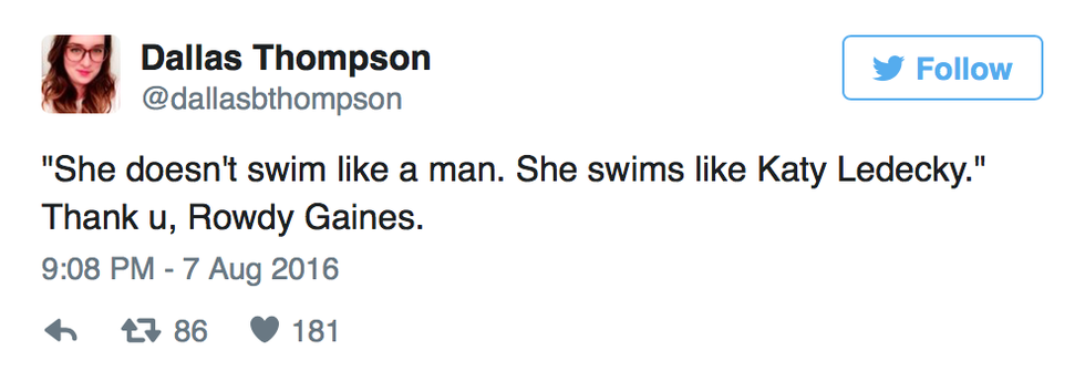 3. When 19-year-old Katie Ledecky broke a world record in the 400-meter freestyle by about two full seconds, NBC commentator Rowdy Gaines said, “Some people say she swims like a man." Again, huh? We should be able to acknowledge her athletic ability without having to compare her to a man. And what's with the media labeling her as the “female Michael Phelps.” Why can't she just be Katie Ledecky?