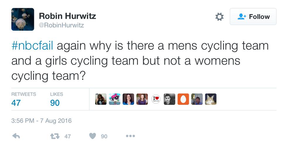 4. Even if you’re a female athlete in the Olympics, you're still labeled as a “girl.” Why? NBC announcers referred to the “men’s cycling team,” and the “girls’ cycling team.” When they are clearly grown women.