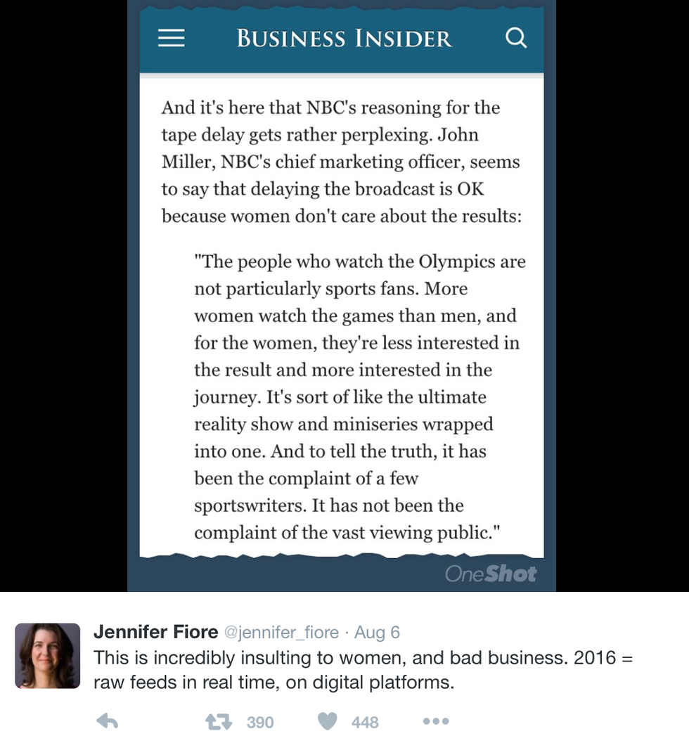 7. NBC’s chief marketing officer John Miller implied that women aren’t into sports. Miller said, “The people who watch the Olympics are not particularly sports fans. More women watch the games than men, and for the women, they’re less interested in the result and more interested in the journey. It’s sort of like the ultimate reality show and miniseries wrapped into one.” Is. He. Kidding? Did he ever once think that women tune in more to the Olympics because It’s the one time that women’s sports are actually highlighted? Again, ignorance at its finest.