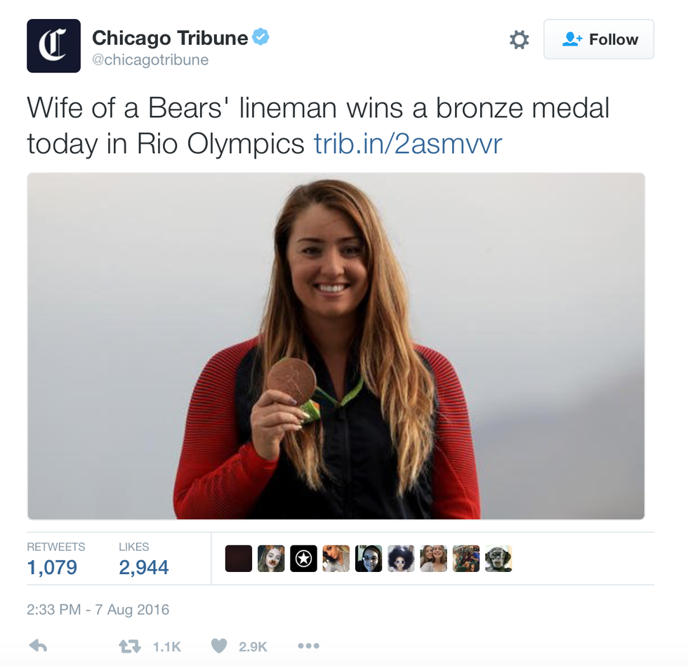 9. The Chicago Tribune labeled two-time bronze medal-winning Olympian Corey Cogdell as “Wife of a Bears’ lineman.” This Olympic medal-winning, world class athlete is being reduced to simply a “wife,” which is not OK. How is being married to a professional football player a more deserving label than a women being one of the best trap shooters in the world? In today's society women are being defined more often by their appearance or marital status rather than by their strength or speed.
