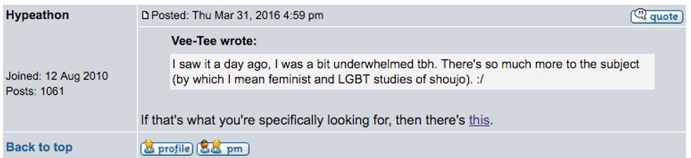 I’m, sadly, one of those people who can’t help reading the comments on every video or article that I come across on the Internet. Luckily, the comments on this article didn’t leave me with a headache. Actually, one user made a comment about being underwhelmed by the documentary and wanting more of a feminist/LGBT study of shōjo. I agreed.