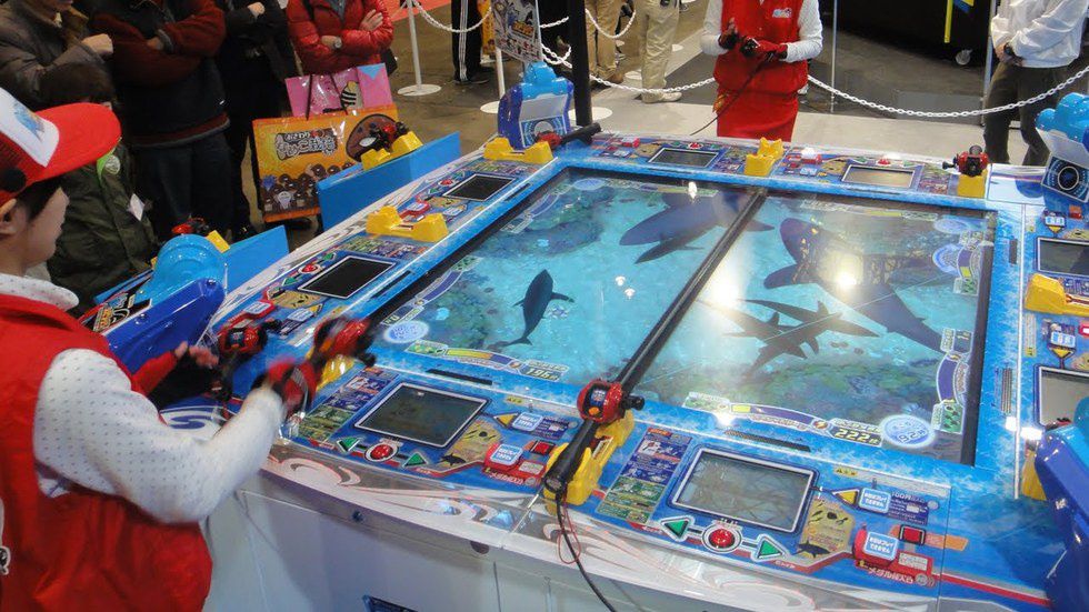 Next, we have multi-floor arcades. The first floor is often very family-friendly, consisting of crane games (called UFO catchers) and other children focused party games. Some examples include small game stations where a child inserts a couple of cards to create a team to play with (kind of like Yu-gi-oh) at the cost of a hundred yen coin and the gain of a new, random card. Others include air-hockey stations, Mario-Kart, zombie shooters, and digital fish-catching games. The first floor is usually very well lit with a friendly, almost festive atmosphere.