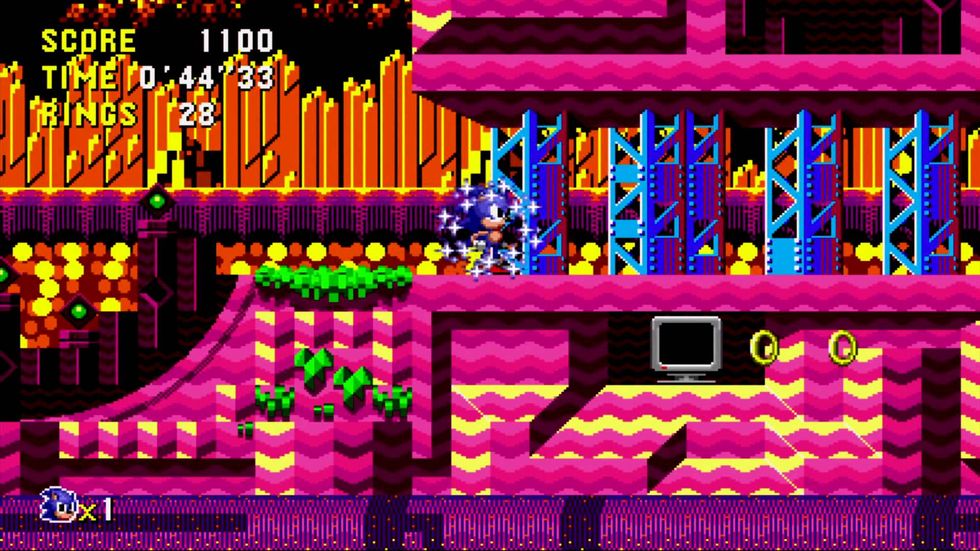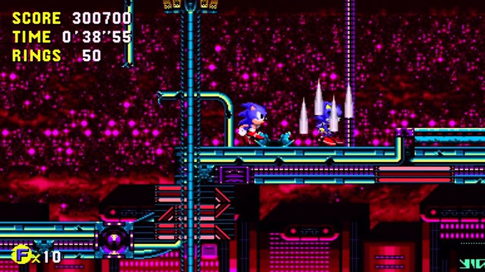 Stardust Speedway: It’s Star Light Zone, took cocaine and has the most odd level design in the entire game. There is a city in the background, with many bright stars in the sky. The foreground is near golden with brass instruments because...why not?! It makes no sense to me. The past is much less of an eyesore as the overall design is simple, with the background having Roman buildings and lovely plant life in the foreground with vines and berries. The good future is CITIES, CARNIVALS, ALL GLORIOUS with a highly detailed purple foreground, but still a bit much. The bad future is near miserable with a red atmosphere with thunder bolts jolting from the sky. But with Act 3, we now battle Metal Sonic by racing him, and it’s not a bad boss, it’s unique and can be challenging when you play it for the first time.
