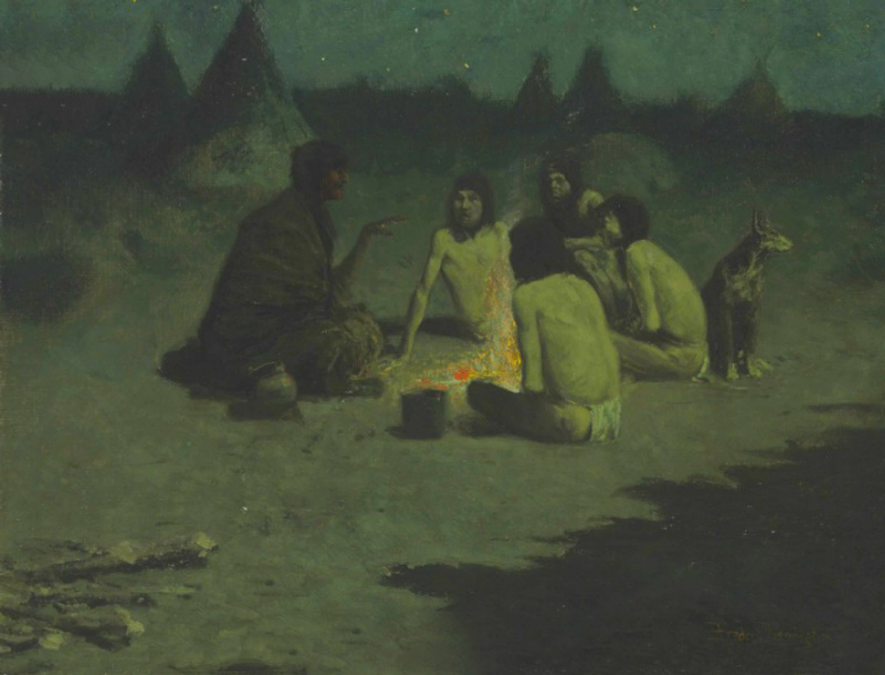 The characteristic action of the American Old West settles down in a gentle, monochromatic painting. Unlike most works of his time — his early portfolio included — the artist here paints a rather sympathetic view of aboriginal people.