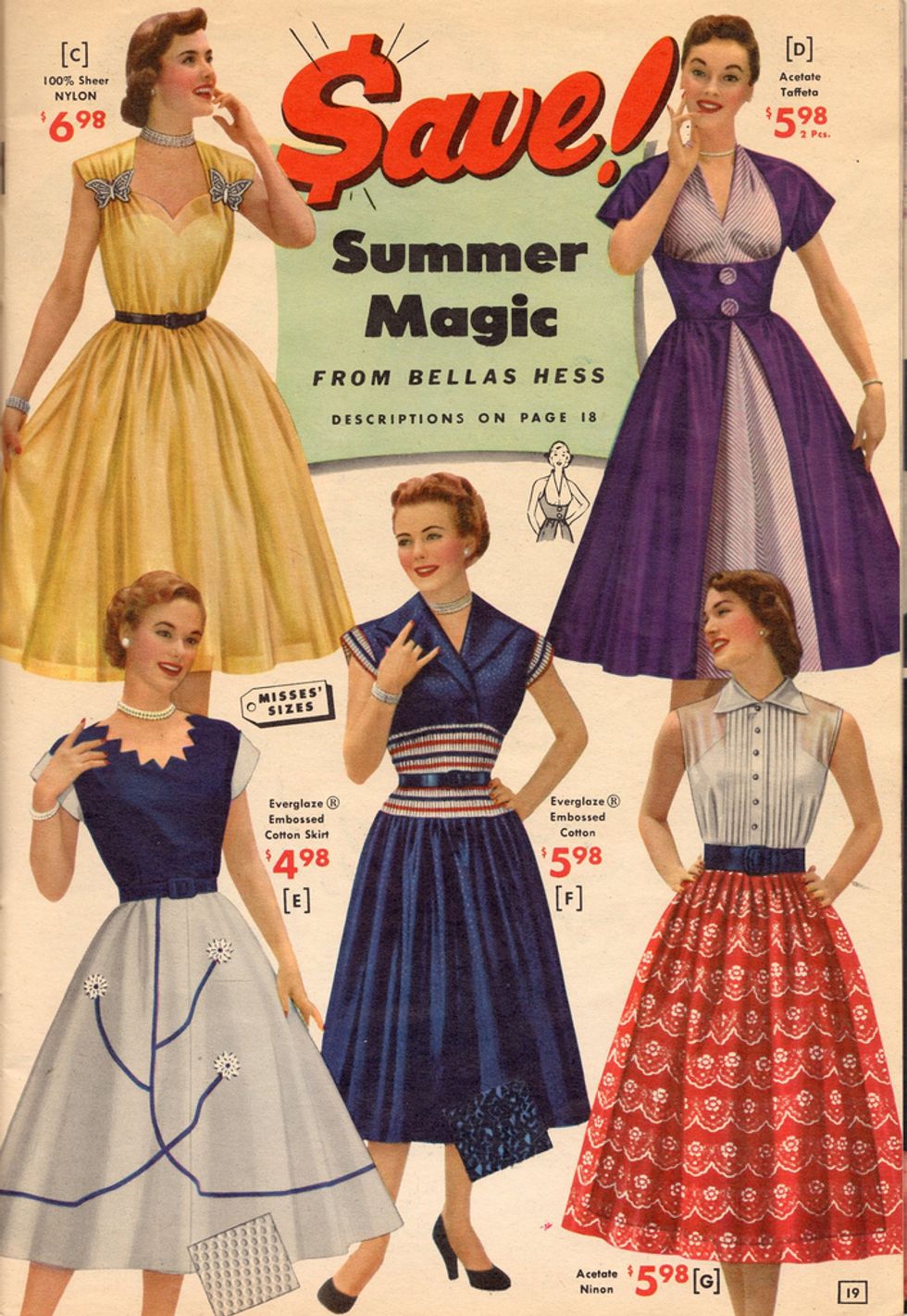 Similar to the baby blue dress I purchased from The Golden Pearl Vintage, the dresses pictured in this advertisement were common parts of any women's closet in the 50s. The dresses are cinched at the waist and have a wide neckline to accentuate their shoulders and neck. Floral prints and basic shapes were common patterns for circle dresses. These pieces received their name because, when women sat down, the dress created a circle shape around them. A day-time dress stopped at the knee, and night-time dresses often flowed to the feet. These dresses are modernized today with looser sewing at the waist and less fabric around the shoulders.