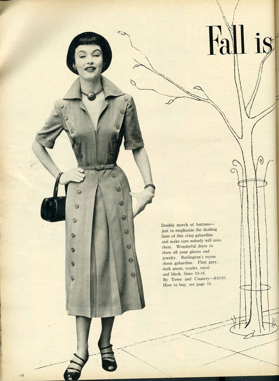 Another prominent piece of a women's outfit was a pair of gloves. The length of the gloves ranged from fairly short (as pictured in the advertisement) to very long (almost to the elbow) for fancier occasions. Women wore white gloves because of the glamorous, Audrey Hepburn-esque look it portrayed. The gloves were typically made of leather and were worn as a standard with all outfits. Some women even matched their gloves to their outfit! Gloves are not as common of pieces today, as most are short and in simple colors, but they sure made a statement in the past.