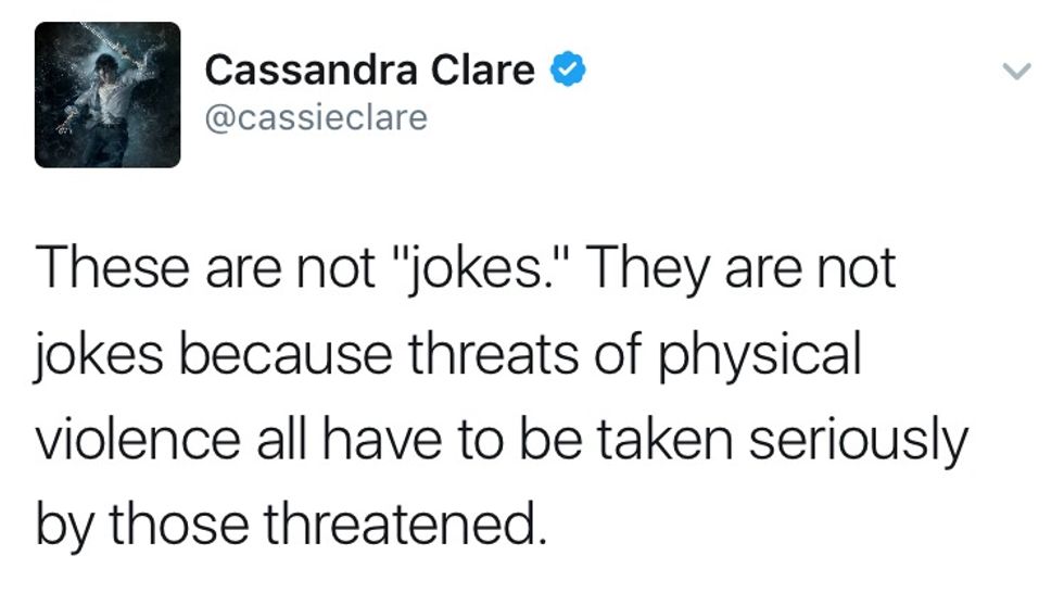 Cassandra Clare, best known for being the author of all of the books and spin-offs of The Shadowhunter Chronicles, receives a lot more hate than most authors I’ve seen through Twitter and other sources. She’s received hate for writing primarily in the same universe (The Shadowhunter Chronicles already has 10+ books making it up with more coming) and even got hate for writing a middle grade series that was criticized as a “Harry Potter knock-off.” She received a ton of hate for rumors going around her fans that she would be killing off a fan favorite character, Alec Lightwood. (You can read her powerful response to that here on her Tumblr). And that doesn’t even really cover the violent threats.