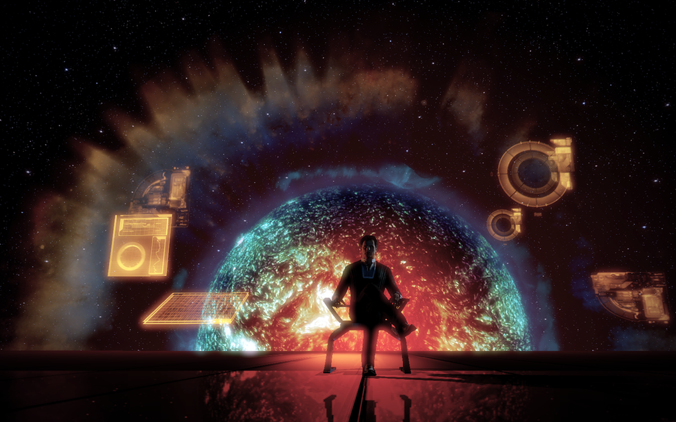 As my friend took my glasses (which would not fit under the headset) and turned the large apparatus on I first stood staring into total darkness. Then the stars appeared above me and in front of me. As I turned around I was greeted with a vision of the sun. I placed my hands in front of me and could no longer see them. While they could still be felt, the only thing I could see was the controllers I held completely unobstructed. Then I loaded into what may have been a prison.