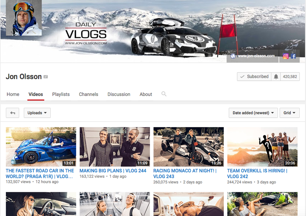 Jon Olsson is an Alpine Ski Racer for Red Bull. He is Swedish and lives in Monaco. Him and his girlfriend are always traveling. It is amazing to see the incredible places they go. I really enjoy watching their daily blogs because of their traveling and also where they live. It isn't in the US so it makes it interesting to see what they do. Find their videos and channel here!