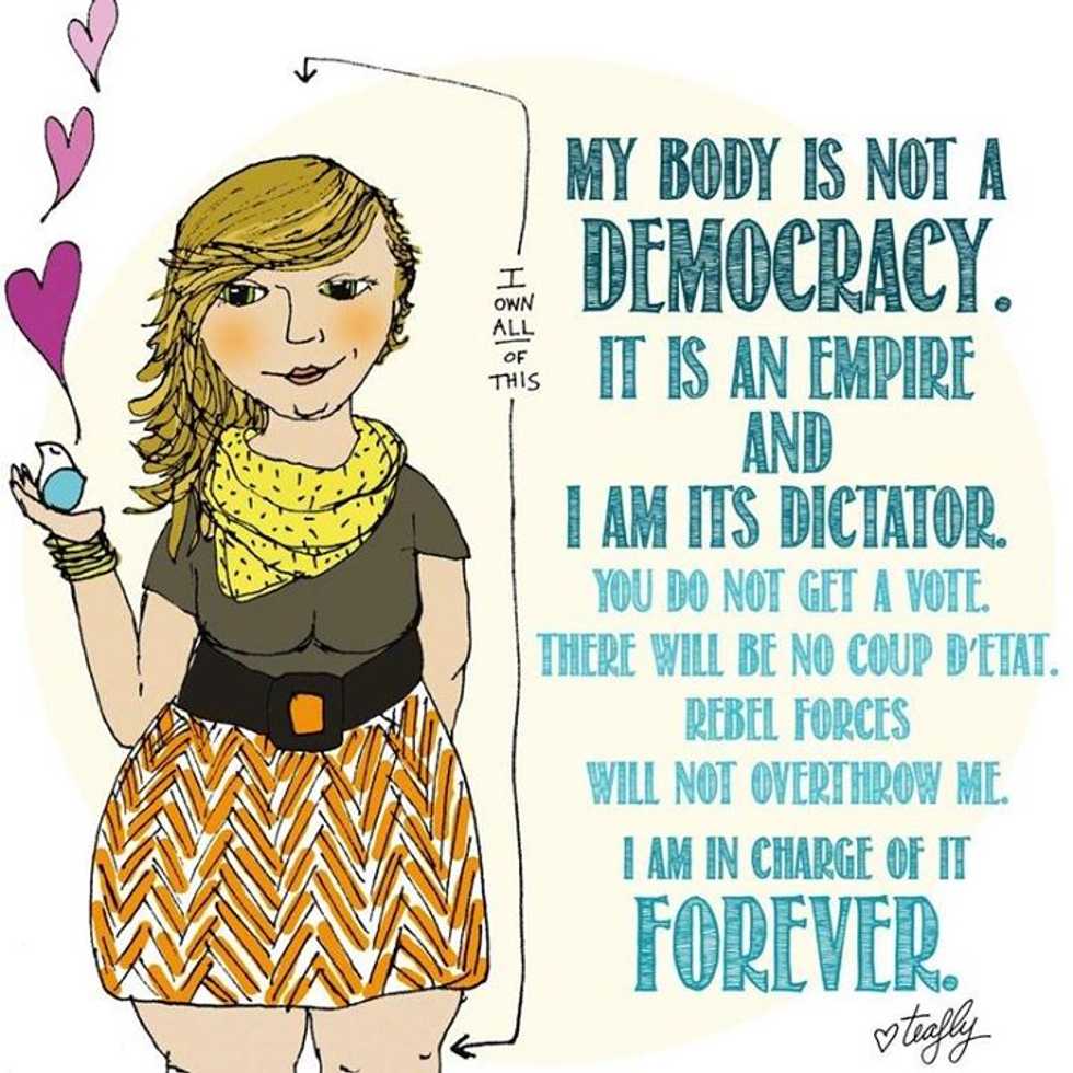 On September 19th my mother shared with me a post by the artist Teafly on Facebook. The post entailed a picture of a woman standing by a quote that stated, “my body is not a democracy. It is an empire and I am its dictator. You do not get a vote. There will be no coup d’état. Rebel forces will not overthrow me. I am in charge of it forever”. Now, while this image is meant to inspire body confidence, a major issue facing all women, I could not help but apply these thoughts and statements to the current arguments about Planned Parenthood, another example of how, once again, the woman’s body is being left up to a vote.