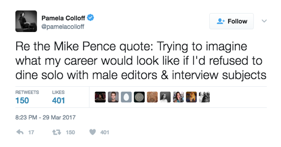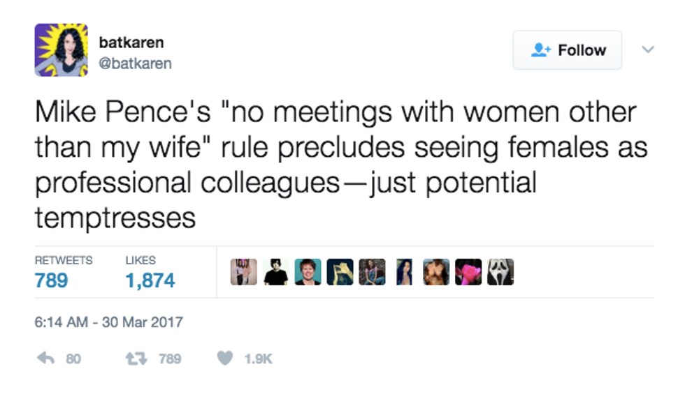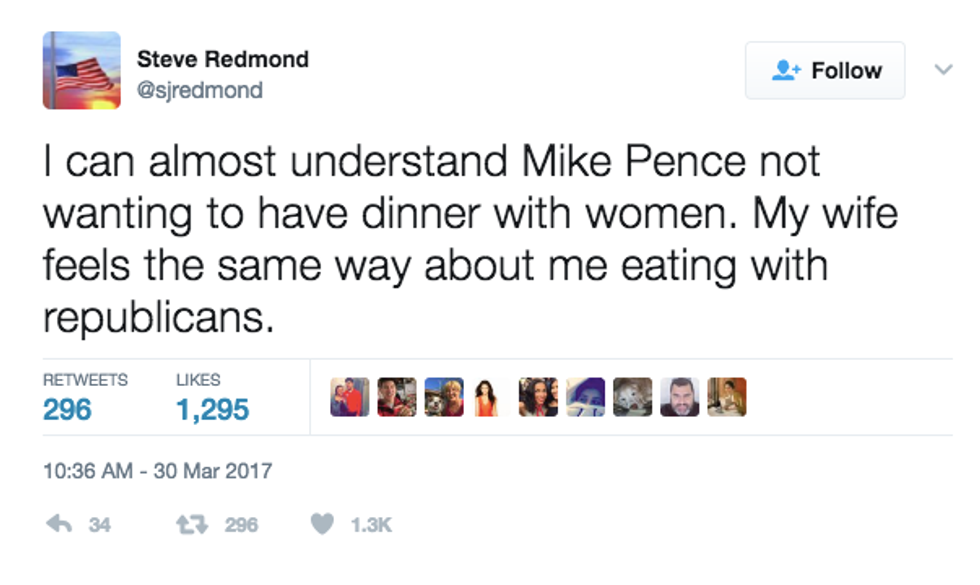 Never once did Pence say he wouldn’t meet with a woman. He never said he wouldn’t have dinner with a women or do business with a woman or travel with a woman. He simply said he wouldn’t do it alone. Quick question: Would you want your spouse doing these things alone with someone of the opposite gender? If you answer yes, deep down, you know the answer is no because the fear of being cheated on is there thanks to society. I know better than to believe you wouldn’t mind your husband/wife to go out alone with the opposite sex for dinner, even if it was for business.