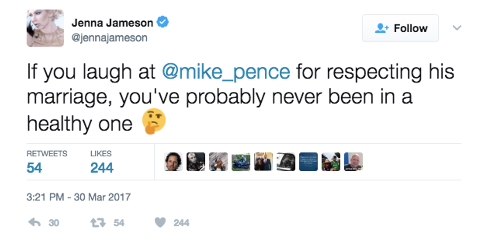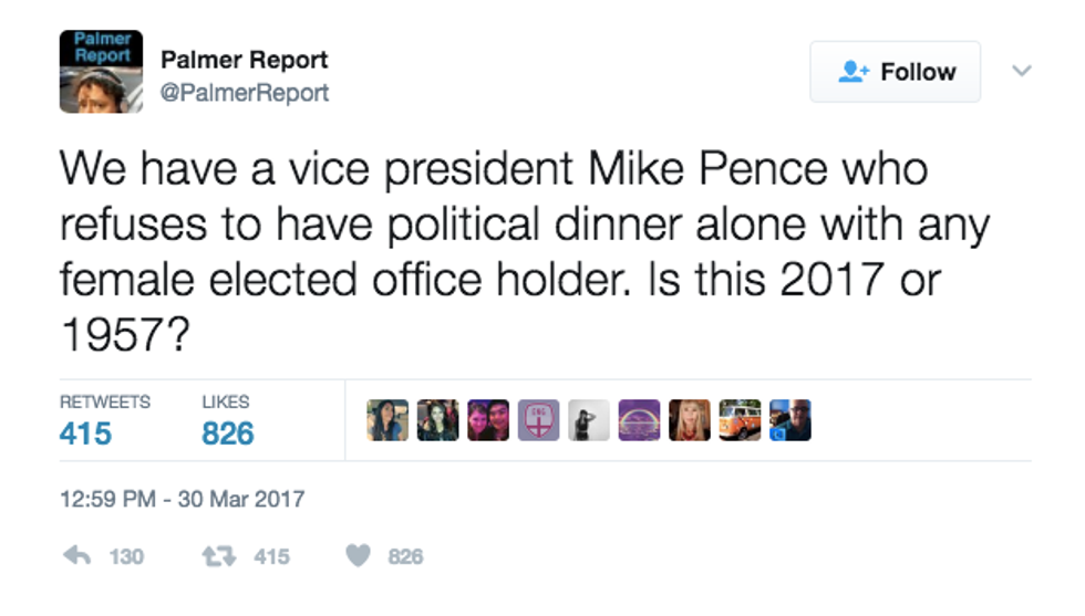 You teach your daughters to wait for a man who respects them, however, we judge not just a man, but a politically powerful man, for respecting his wife and setting an example as to not cheat on your woman. It just doesn’t add up. I’m honestly ashamed of where we are morally in the United States today. I’m ashamed of the fact that people are mad a man respects his wife. Mike Pence, for whatever it’s worth, I support you 100 and I hope my future husband respects me as much as you respect Karen.