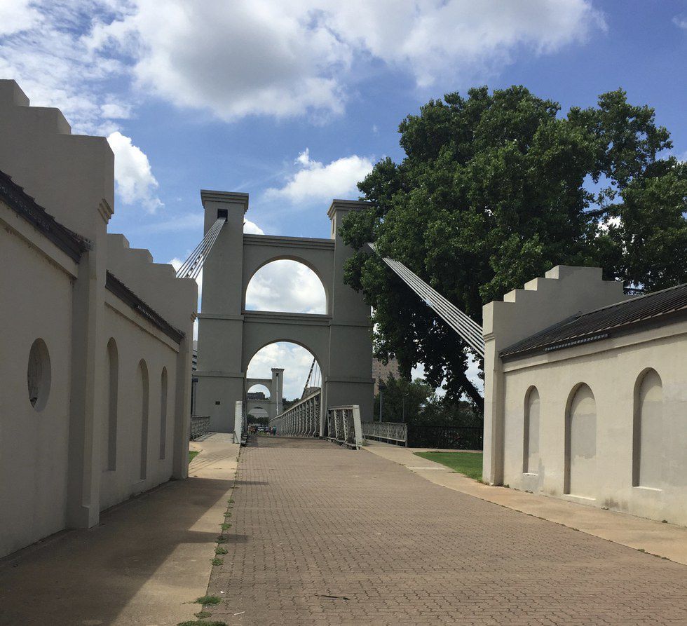 Formally known as the "Chisholm Trail" in 1870, before being sold to McLennan County. This beautiful bridge suspends across the Brazos River and transported cattle herds, pedestrians, and wagons for a toll. The city of Waco pleaded for the trail to be at no cost and was not until 1889 when the suspension bridge was sold and given to the city of Waco as a toll-free bridge! The county of McLennan then named it "The Waco Suspension Bridge". Still to this day you can see where the toll booths were to charge the traffic going across. In 1870, Chisholm Trail was very popular, as it was the biggest suspension bridge west of the Mississippi River. On either side of this bridge are two parks, Martin Luther King Jr. Park and the Indian Spring Park. Many people from the city of Waco come here, especially college students as it is Baylor tradition to throw tortillas off of this bridge. Tortillas are thrown in hopes to land on the concrete remains from another bridge near The Waco Suspension Bridge and is said to be good luck for those planning on graduating in four years. As you walk down The Waco Suspension Bridge, you can see many tortilla wrappers and ducks eating on the tortillas.