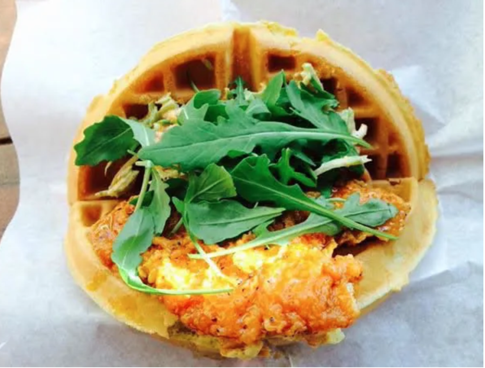 Available on the Sleepy Hollow menu in Disney World's Magic Kingdom, this deep-pocketed Belgian waffle comes with a hunk of Sriracha-spiced chicken and arugula. Click through for the full recipe.