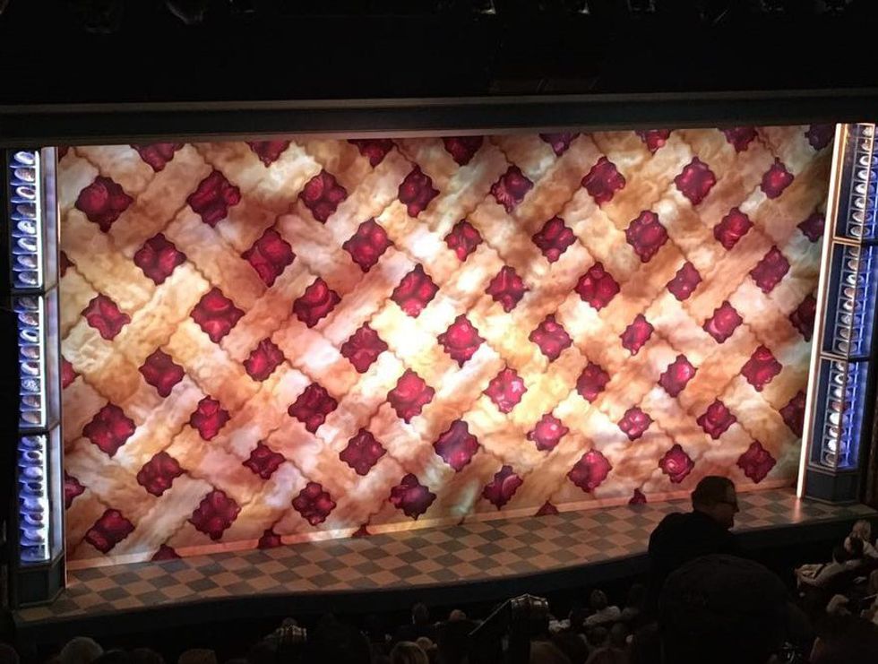 When you first walk into the theater, it’s like you walk into a diner. The walls are blue and brightly decorated. You turn the corner to find the curtain which is decorated as a big piece of pie. Not craving pie yet? Don’t worry, you will. The sweet aroma of pie flutters around your nose and fills up the theater as it gets to show time. No, they do not pump the smell of pie through the theater, they actually bake a pie in the lobby. There is an actual working oven in the lobby, and a pie is baked during each performance to fill the theater with the smell of it. (How amazing is that!) There are also girls walking around in waitress uniforms selling small jars of pie. Although it is a little pricey ($10 for a jar), it is so worth it. With a mini pie in hand, you find your way to your seat and snack on the pie while the show begins.