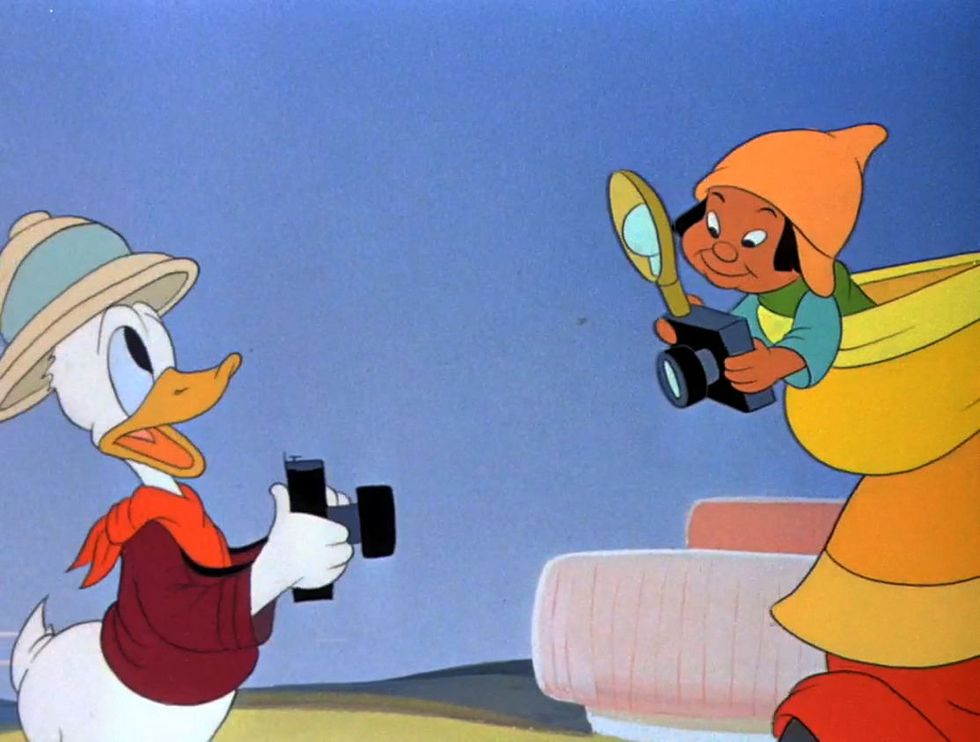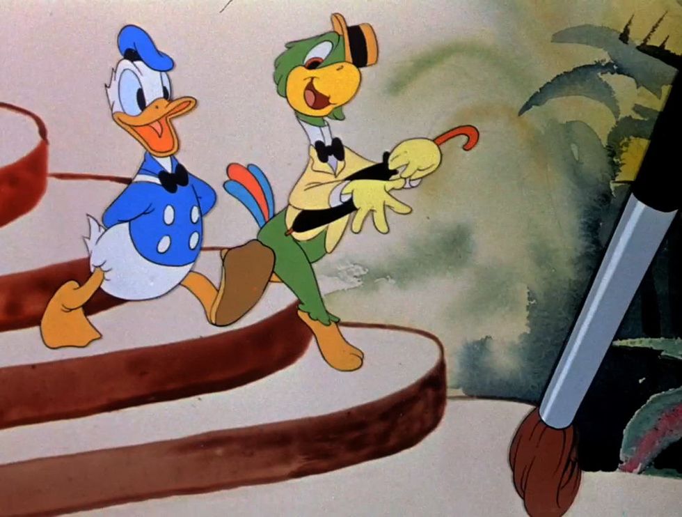 The second half keeps the same clever visual techniques, but it's also where the comedy comes in. Donald comes back, this time exploring Rio de Janeiro, and is introduced to José Carioca (voiced by Brazilian musician José Oliveira). What ensues is a musical sequence that takes full advantage of the medium of animation. As José teaches Donald about samba, the music starts up again and things like hats and umbrellas become musical instruments. While they walk throughout a more minimalist version of Rio, the offscreen painter returns and creates their surroundings as they enter them.