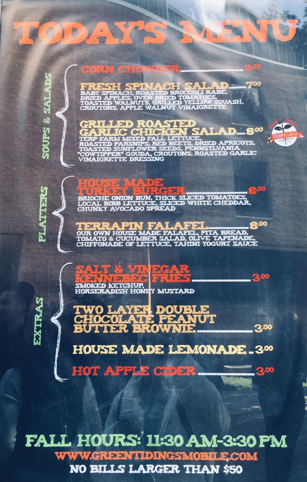 Instead of eating at a chain on Route 1, stop by the Green Tidings truck. Above is one of their menus. The truck serves food from local farmers and provides recyclable and compostable packaging. Compost is collected outside of the truck and in the kitchen. Unused food from the kitchen is composted, recycled, and donated to the Food Recovery Network (a student group that donates unused leftovers on campus) whenever possible. My personal favorites are the hot apple cider or any of the specialty lemonades.