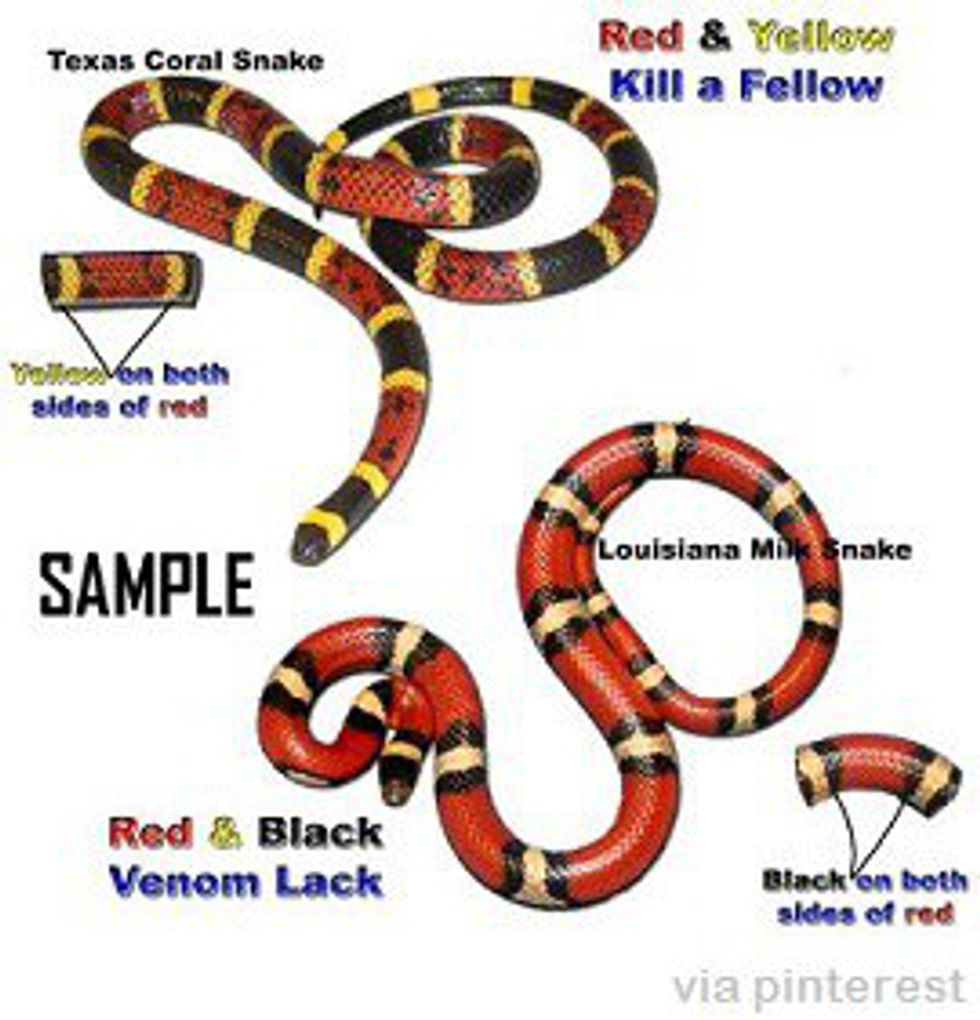 If you live around the eastern and southeastern United States, you might have to worry about this. There are two different species of snakes, one known as the king snake and the other known as the coral snake. They are particularly remarkable because of their properties compared to each other. They both have a color scheme made up of red, yellow, and white stripes, making them hard to distinguish between. But the thing is that they are on the opposite sides of the snake spectrum. The king snake is mostly harmless and can even be kept as a pet. On the other hand, the coral snake is an extremely venomous snake that can cause slurred speech, paralysis, cardiac arrest, and even death if left untreated. So it is very important that you know the difference between the two. Thankfully, there are several ways to do this. The patterns of these colors on these two types of snakes are not exactly the same. The easiest way to remember is to look at the yellow stripes. If they touch the black stripes, then it’s a king snake, and it’s safe. If they touch the red stripes, then it’s a coral snake, and you should stay away. Just remember the rhyme, “If red touches yellow, you’re a dead fellow.”