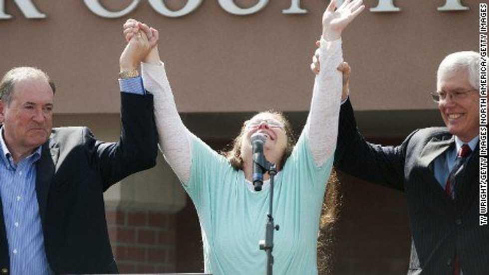 Five days later- September 8- Davis was greeted outside the jailhouse by her supporters, who came in droves to cheer on her cause. Davis met both her lawyer and Republican presidential candidate Mike Huckabee on a set up stage, running out to Survivor's "Eye of the Tiger" as her theme song. Sounds more along the lines of an inhumane punchline to an Aristocrats joke but that actually happened. Davis emerges "victorious" from her "ordeal". An ordeal comprised of imposing one's beliefs onto others, persecuting those for their sexuality, and plainly not doing a job one is employed to do. Davis' newfound followers, drawn in by her religious convictions, exclaim her to be a hero. Teachers from my hometown school district sat in jail for just as long, probably even longer, for going on strike in 2001. The plight of the teacher in a country that does not value its education as much as it should, that is a true cause worth rallying behind.